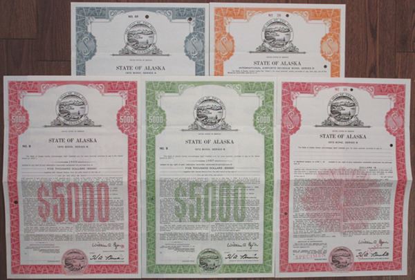 Alaska. Lot includes 5 pieces: $5000 Specimen 4% Coupon Bond in red; $5000 Specimen 4% Coupon Bond in green; $Odd Specimen %Odd Bond in red; $Odd Specimen %Odd Bond in orange; $Odd Specimen %Odd Bond in blue. All are in XF condition, Northern BNC. (5)