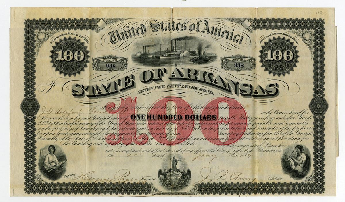 Arkansas. $100 Specimen 7% Levee Bond, Issued and Uncancelled. Vignette of riverboat at top center of certificate. Fine condition with creases at folds and splitting top middle, NBNC.