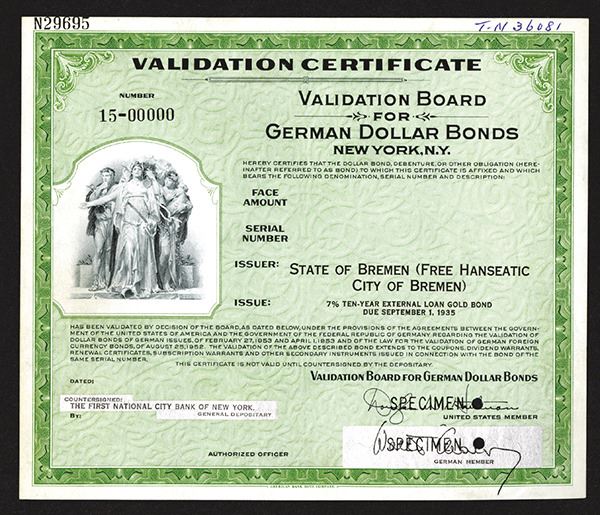 New York, New York. Validation Board for German Dollar Bonds, black on green, two women and a child, ABNC, Unc; "T-N36081" written in top right margin.