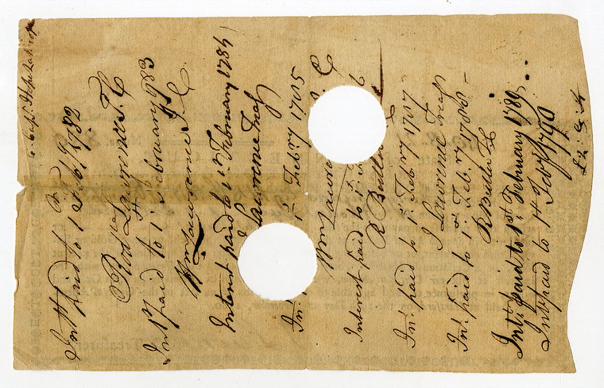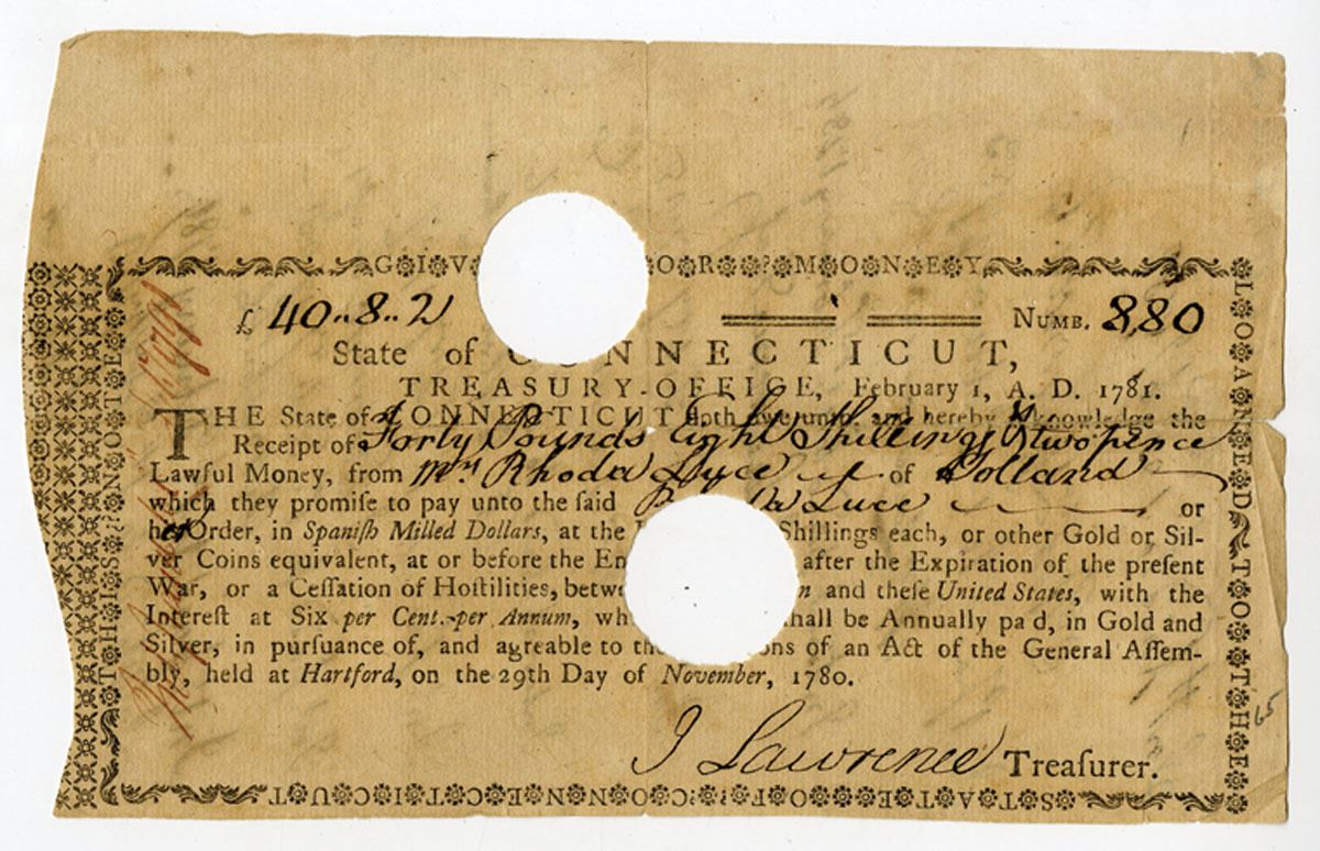 Hartford, Connecticut, 1780. I/C Treasury Receipt to be paid in Spanish Milled Dollars with 6% interest in Gold or Silver signed by signed by John Lawrence as Treasurer of the State of Connecticut. Black text with black border, Endorsements written on back, S/N 880, Cut cancelled at center. John Lawrence (1719-1802) served as treasurer of the Connecticut colony, and later as the Connecticut State Treasurer from 1769 to 1789, spanning the crucial period of colonial rule, through the American revolution and into the early years of the United States. During the Revolutionary War, Lawrence was commissioner of loans for the new nation. VF condition.