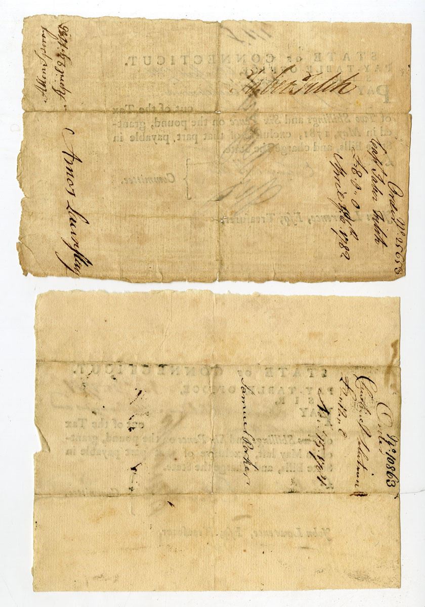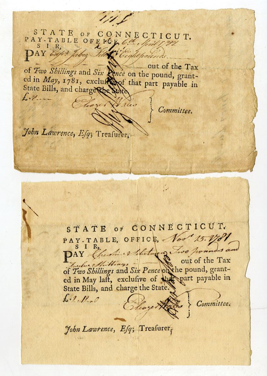 Connecticut, 1781-82. Lot of 2 Promissory Notes Issued by the Pay-Table. One is dated November 15, 1781 and the other is dated April 6th, 1782. Both notes are signed by Eliazer Wales at bottom. Promissory Notes like this were issued by the State of Connecticut to help finance the Revolutionary War. Military finances in the state of Connecticut were managed by the Pay-Table which was also known as the Committee of Four during the Revolutionary War. VF condition with some toning and fragile fold lines. Signatures on both are from important figures in early Connecticut history. (2)