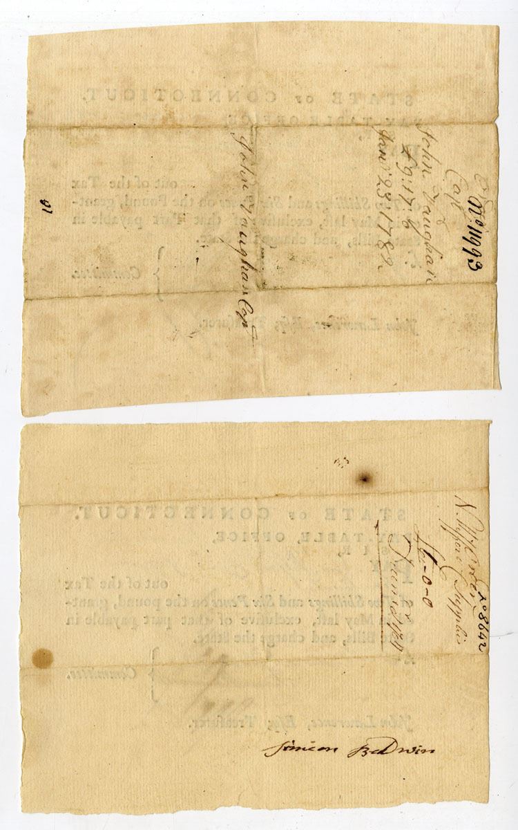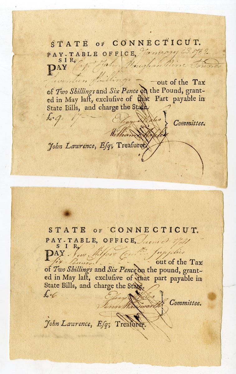 Connecticut, 1781-82. Lot of 2 Promissory Notes Issued by the Pay-Table. One is dated December 1781 and the other is from January 23rd, 1782. Promissory Notes like this were issued by the State of Connecticut to help finance the Revolutionary War. Military finances in the state of Connecticut were managed by the Pay-Table which was also known as the Committee of Four during the Revolutionary War. VF condition with some toning and fragile fold lines. Signatures on both pieces are from important figures in early Connecticut history. (2)