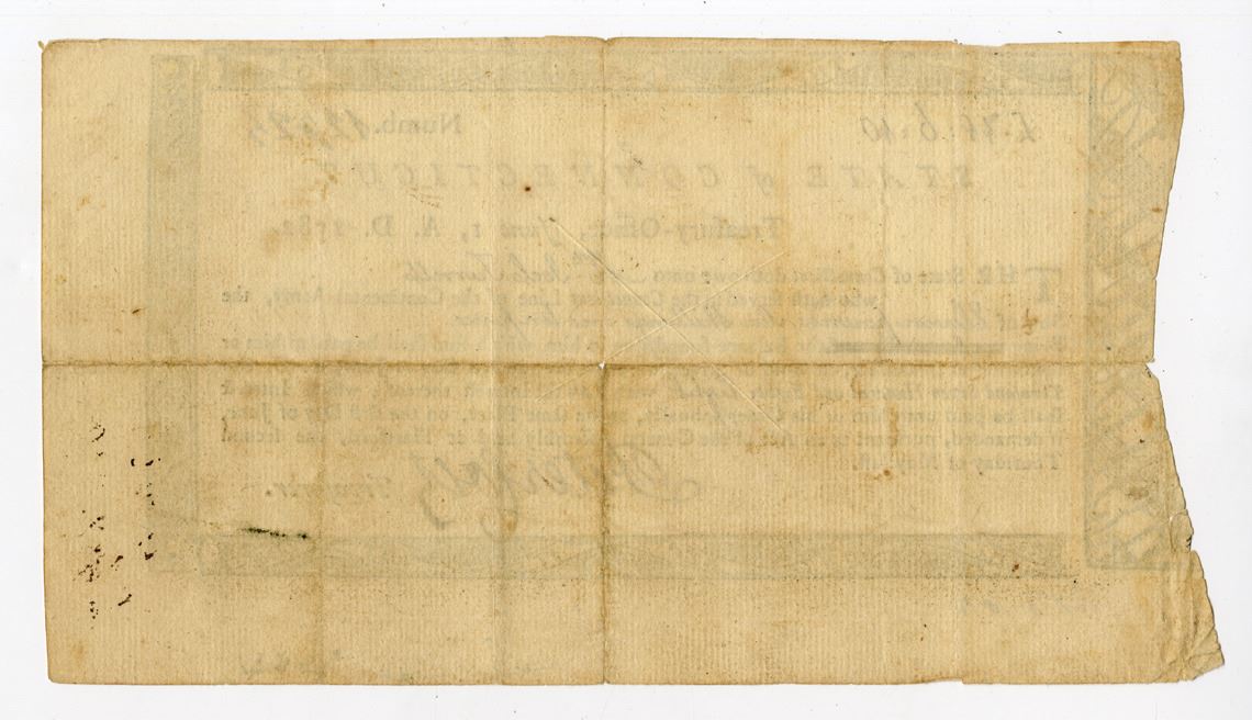 Hartford, Connecticut, 1782. £11. 6/-. 10d. I/C payment for service in the Continental Army and signed by Peter Colt as Treasurer of the State of Connecticut, Black text with black border, S/N 12724, Cut Cancelled at center. Peter Colt (1744-1824) was the Commissary General of Connecticut in 1782, responsible for managing supplies and logistics for the state's militia and Continental Army. His duties involved procuring, storing, and distributing essential provisions during the Revolutionary War. ColtÕs effective management helped sustain ConnecticutÕs forces during a time of resource shortages, making his role crucial to the overall war effort. VF to XF condition with small ink stain at bottom.