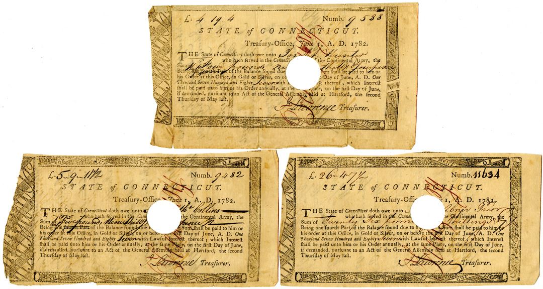 Hartford, Connecticut, 1782. Lot of 3 pieces, all are I/C payments for service in the Connecticut Line of the Continental Army, signed by John Lawrence as Treasurer of the State of the Connecticut at bottom. All have black text with black border, hole cancelled at center with red handwriting, and black handwriting on back. John Lawrence (1719-1802) served as treasurer of the Connecticut colony, and later as the Connecticut State Treasurer from 1769 to 1789. During the Revolutionary War, Lawrence was commissioner of loans for the new nation. One is in Fine condition with splitting along margins, while two are in Fine-VF condition. (3)