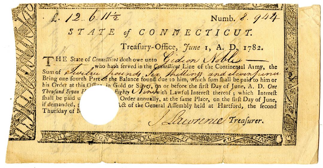 Hartford, Connecticut, 1782. I/C Payment for 12 Pounds, 6 Shillings and 11 1/2 Pence, for service in the Connecticut Line of the Continental Army, signed by John Lawrence as the Treasurer of the State of Connecticut. Black text with black border, hole cancelled at center, with black handwriting on back. John Lawrence (1719-1802) served as treasurer of the Connecticut colony, and later as the Connecticut State Treasurer from 1769 to 1789, spanning the crucial period of colonial rule, through the American revolution, and into the early years of the United States. During the Revolutionary War, Lawrence was commissioner of loans for the new nation.
