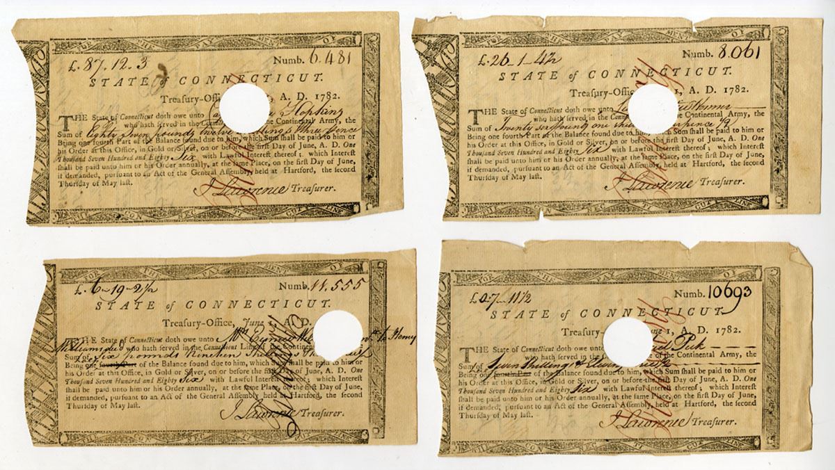 Hartford, Connecticut, 1782.... Lot of 4 certificates, all are I/C payments for service in the Continental Army and signed by John Lawrence as Treasurer of the State of Connecticut. All have black text with black border and hole cancelled at center, All have endorsements written on backs. John Lawrence (1719-1802) served as treasurer of the Connecticut colony, and later as the Connecticut State Treasurer from 1769 to 1789. During the Revolutionary War, Lawrence was commissioner of loans for the new nation. Fine to VF condition. (4). Sold "AS IS" no returns accepted.