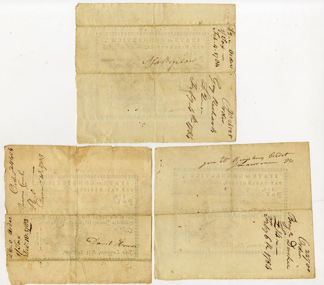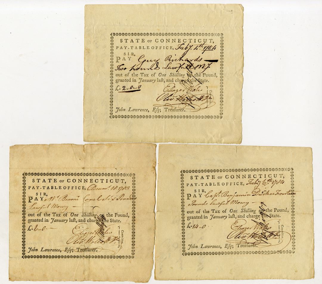 Connecticut, 1783-84. Lot of 3 Tax Warrants "Granted in January last" text, Issued to Guy Richards for 2 Pounds; Wm. Benoni Conel for 6 Pounds; and Capt. Benjamin Durkee for 14 Pounds. All have black text with black borders. Lot includes signatures from Connecticut leaders such as Eleazer Wales and Oliver Wolcott Jr., one piece also has Samuel Wyllys' signature across. The Pay-Table (also known as the Committee of Four) managed Connecticut's military finances during the Revolutionary War. Its members rotated during the lengthy confrontation with England. Financing the Revolution laid a heavy burden upon each colony, especially those which balked at levying taxes. In order to meet immediate needs, such as wages, the colonies relied upon wealthy revolutionists, foreign loans, and taxes and gifts from abroad. Issuing notes such as these was only a temporary solution. Oliver Wolcott Jr. (January 11, 1760 - June 1, 1833) was the second United States Secretary of the Treasury, a judge of the United States Circuit Court for the Second Circuit, and the 24th Governor of Connecticut. He was a member of the Pay-Table Committee for several years, and was a commissioner to settle claims of Connecticut against the United States from 1784 to 1788. In 1796, he was George and Martha Washington's intermediary in getting the Collector of Customs for Portsmouth, New Hampshire, Joseph Whipple, to capture and send an escaped slave, Oney (sometimes Ona) Judge, back to Mount Vernon. He was ultimately unsuccessful. When Wolcott died in 1833 in New York City, he was the last surviving cabinet member of the Washington administration. Eleazer Wales was another member of the Pay-Table whose signature appears on documents from the period. Samuel Wyllys (January 4, 1739 - June 9, 1823) was an American military officer in the American Revolution, Connecticut politician, and a member of the Wyllys–Haynes family. Benjamin Durkee was a Captain in the Connecticut militia. Fine condition with some toning and fold lines. Interesting trio of early Connecticut history. (3)