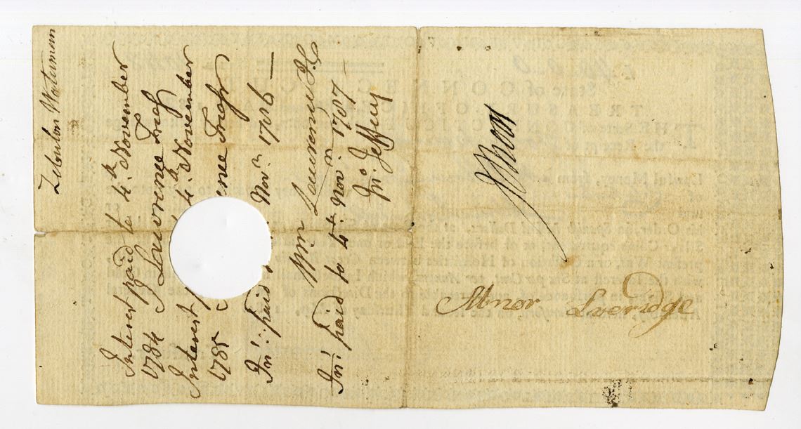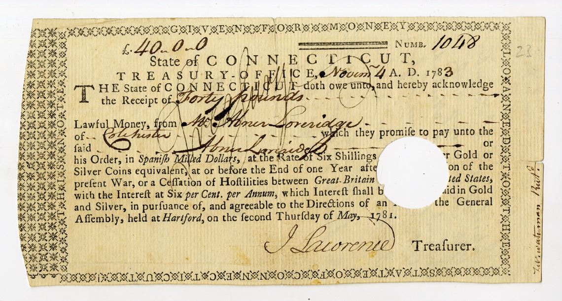 Hartford, Connecticut, 1781. £40, I/C Treasury Receipt to be paid in Spanish Milled Dollars with 6% interest in Gold or Silver signed by John Lawrence as Treasurer of the State of Connecticut. Black text with black border and hole cancelled at center, Endorsements written on back, S/N 1048. Signed by John Lawrence (1719-1802) who served as treasurer of the Connecticut colony, and later as the Connecticut State Treasurer from 1769 to 1789. VF condition with toning. Black text and handwriting, POC at center. The loan was "payable in gold or silver coins...after cessation of hostilities between Great Britain and these United States." Financing the Revolution laid a heavy burden upon each colony, especially those which balked at levying taxes. In order to meet immediate needs, such as wages, the colonies relied upon wealthy revolutionists, foreign loans, and taxes and gifts from abroad. Issuing notes, like these, was only a temporary solution. John Lawrence (1719-1802) served as treasurer of the Connecticut colony, and later as the Connecticut State Treasurer from 1769 to 1789, spanning the crucial period of colonial rule, through the American revolution, and into the early years of the United States. During the Revolutionary War, Lawrence was commissioner of loans for the new nation. Rare loan document and one of the first ones issued mentioning the "United States."