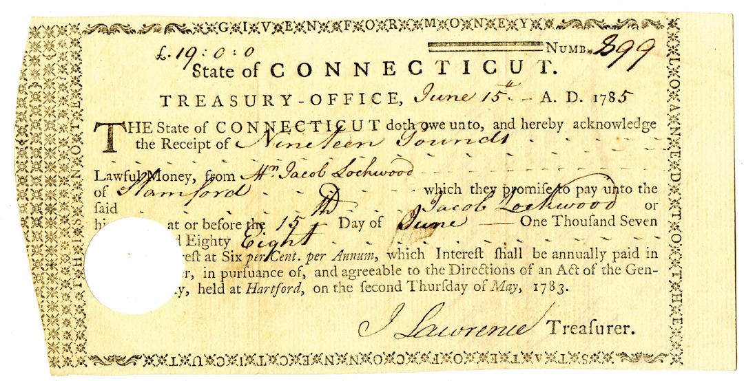 Hartford, Connecticut. June 15th, 1785. Issued Treasury Office Note for 19 Pounds "lawful money" from Jacob Lockwood of Stamford, Connecticut. The sum was to be paid back on or before 1788 with interest at 6% per annum. Black text with black handwriting, S/N 899, and signed by John Lawrence as Connecticut Treasurer. John Lawrence (1719-1802) served as treasurer of the Connecticut colony, and later as the Connecticut State Treasurer from 1769 to 1789, spanning the crucial period of colonial rule, through the American revolution, and into the early years of the United States. During the Revolutionary War, Lawrence was commissioner of loans for the new nation. VF condition.