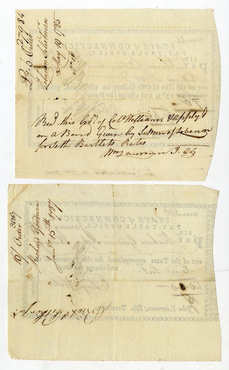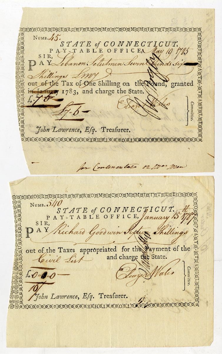 Connecticut, 1785-87. Lot of 2 Promissory Notes Issued by the Pay-Table. One is dated May 10th, 1785 with S/N 45 and the other is dated January 15th, 1787 with S/N 540. Notes are both signed by Eliazer Wales. Promissory Notes like this were issued by the State of Connecticut to help finance the Revolutionary War. Military finances in the state of Connecticut were managed by the Pay-Table which was also known as the Committee of Four during the Revolutionary War. VF-XF condition with some toning and fragile fold lines. Signatures on both documents are from important figures in early Connecticut history. (2)