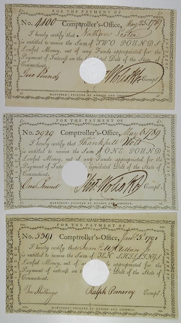 Connecticut, lot of 3 Scrip notes, 10 Shillings; 1 Pound and 2 Pounds, All with large POC's, VF to Choice VF. Signed by Ralph Pomery or Oliver Wolcott as Comptroller.