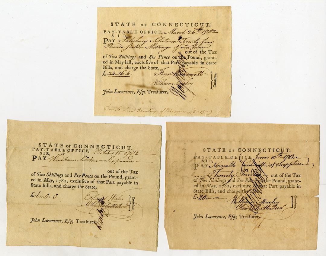 Connecticut, 1782. Lot of 3, I/C, Tax Warrants issued by the Pay-Table Office in Hartford. Warrants were issued for £6; £20; and £24.16.6. All have black print without any border. The Pay-Table (also known as the Committee of Four) managed Connecticut's military finances during the Revolutionary War. Financing the Revolution laid a heavy burden upon each colony, especially those which balked at levying taxes. In order to meet immediate needs, such as wages, the colonies relied upon wealthy revolutionists, foreign loans, and taxes and gifts from abroad. Issuing notes such as these was only a temporary solution. William Moseley (1755-1824) later would serve in the Connecticut state senate, while Eleazer Wales was another member of the Pay-Table. Ralph Pomeroy, who was to receive the payment, was a paymaster in the Continental Army. Eleazer Wales was graduate of Yale and Presbyterian Minister who also later served as a Justice of the Peace in Hartford. He remained involved in state politics, acting as State Controller after the war. Fenn Wadsworth (1750/51-1785) was a brigade major to General James Wadsworth from 1776 to 1779. He fought in many battles during that time, but his failing health forced him to leave active service. Wadsworth stayed in Connecticut's government, as shown by his membership to the Pay-Table Committee. Oliver Wolcott Jr. (January 11, 1760 - June 1, 1833) was the second United States Secretary of the Treasury, a judge of the United States Circuit Court for the Second Circuit, and the 24th Governor of Connecticut. He was a member of the Pay-Table Committee for several years, and was a commissioner to settle claims of Connecticut against the United States from 1784 to 1788. When Wolcott died in 1833 in New York City, he was the last surviving cabinet member of the Washington administration. Pieces are in VF-XF condition. (3). Sold "AS IS" no returns accepted.