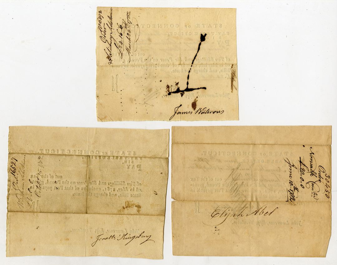 Connecticut, 1782. Lot of 3, I/C, Tax Warrants issued by the Pay-Table Office in Hartford. Warrants were issued for £6; £20; and £24.16.6. All have black print without any border. The Pay-Table (also known as the Committee of Four) managed Connecticut's military finances during the Revolutionary War. Financing the Revolution laid a heavy burden upon each colony, especially those which balked at levying taxes. In order to meet immediate needs, such as wages, the colonies relied upon wealthy revolutionists, foreign loans, and taxes and gifts from abroad. Issuing notes such as these was only a temporary solution. William Moseley (1755-1824) later would serve in the Connecticut state senate, while Eleazer Wales was another member of the Pay-Table. Ralph Pomeroy, who was to receive the payment, was a paymaster in the Continental Army. Eleazer Wales was graduate of Yale and Presbyterian Minister who also later served as a Justice of the Peace in Hartford. He remained involved in state politics, acting as State Controller after the war. Fenn Wadsworth (1750/51-1785) was a brigade major to General James Wadsworth from 1776 to 1779. He fought in many battles during that time, but his failing health forced him to leave active service. Wadsworth stayed in Connecticut's government, as shown by his membership to the Pay-Table Committee. Oliver Wolcott Jr. (January 11, 1760 - June 1, 1833) was the second United States Secretary of the Treasury, a judge of the United States Circuit Court for the Second Circuit, and the 24th Governor of Connecticut. He was a member of the Pay-Table Committee for several years, and was a commissioner to settle claims of Connecticut against the United States from 1784 to 1788. When Wolcott died in 1833 in New York City, he was the last surviving cabinet member of the Washington administration. Pieces are in VF-XF condition. (3). Sold "AS IS" no returns accepted.
