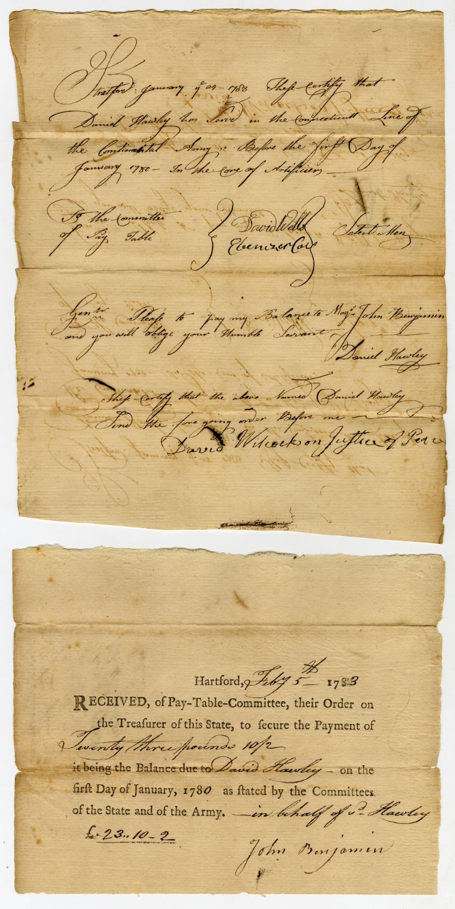 Hartford, Connecticut, 1783. £23, 10/- 2d. I/U payment receipt for David Hawley's service in the Continental Army, "David Hawley has served in the Connecticut Line of the Continental Army". Lot includes letter from David Hawley regarding payment to be give to Maj. John Benjamin. Letter is authenticated and signed by David Wilcocks, Justice of Peace. The letter is also signed by Ebenezer Colt and David Wells as Selectmen for the Committee of the Pay Table. David Hawley (1742-1823) served as Treasurer of Connecticut, where he was responsible for managing the state's finances during the challenging post-Revolutionary War period. His role was crucial in overseeing state finances, managing debt, and contributing to economic recovery. David Wilcocks was a prominent figure in Connecticut during the late 18th and early 19th centuries. He served as a Justice of the Peace and was involved in local governance, contributing to the administration of justice and public affairs in the state during the post-Revolutionary period. Note and letter range from VF to XF condition. (2). Sold "AS IS" no returns accepted.