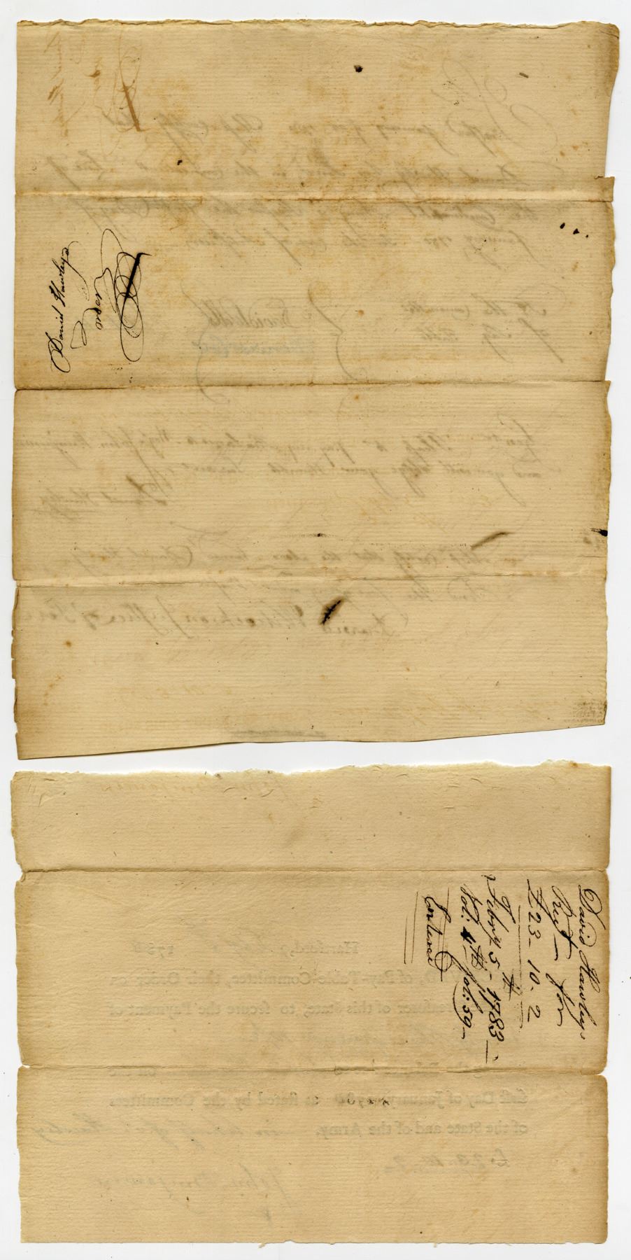 Hartford, Connecticut, 1783. £23, 10/- 2d. I/U payment receipt for David Hawley's service in the Continental Army, "David Hawley has served in the Connecticut Line of the Continental Army". Lot includes letter from David Hawley regarding payment to be give to Maj. John Benjamin. Letter is authenticated and signed by David Wilcocks, Justice of Peace. The letter is also signed by Ebenezer Colt and David Wells as Selectmen for the Committee of the Pay Table. David Hawley (1742-1823) served as Treasurer of Connecticut, where he was responsible for managing the state's finances during the challenging post-Revolutionary War period. His role was crucial in overseeing state finances, managing debt, and contributing to economic recovery. David Wilcocks was a prominent figure in Connecticut during the late 18th and early 19th centuries. He served as a Justice of the Peace and was involved in local governance, contributing to the administration of justice and public affairs in the state during the post-Revolutionary period. Note and letter range from VF to XF condition. (2). Sold "AS IS" no returns accepted.
