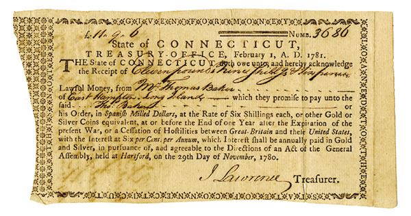 Hartford, CT. November 29th, 1780 issued in 1781 for £11, 9/-, 6 pence, Issued, Cut cancel in center, S/N 3686, Issued to Thomas Baker of East Hampton, Long Island, Signed by J. Lawrence as Treasurer, Moderate foxing and toning, Fine to VF, interest paid endorsements on back payable from 1782 until 1785 when cancelled. Rare loan document and one of the first ones issued mentioning the "United States". "Payable in gold or silver coins....after cessation of hostilities between Great Britain and these United States."