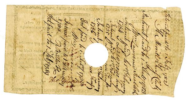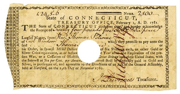 Hartford, CT. November 29th, 1780 issued in 1781 for £24, 5/-, 6 pence, Issued, POC in center, S/N 2100, Issued to Thomas Potioine of East Windsor, Signed by J. Lawrence as Treasurer, Light foxing and toning, Fine to VF, interest paid endorsements on back payable from 1782 until 1789 when cancelled. Rare loan document and one of the first ones issued mentioning the "United States". "Payable in gold or silver coins....after cessation of hostilities between Great Britain and these United States."