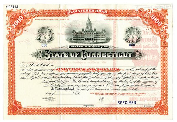 Connecticut. $1000 Specimen 3 1/2% Tax Free Bond, Black print on orange border and under tint, State House of Connecticut at top, Specimen overprints and POC's, VF-XF condition, ABNC.