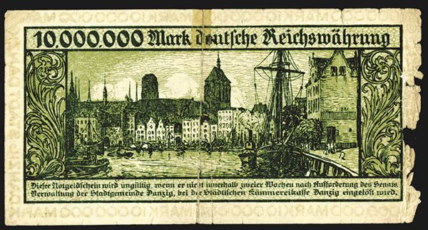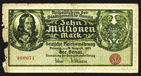 Danzig. 10 Millionen Mark. Hevelius at left, State arms at right. Paper separation at fold, paper loss at left end. Good.