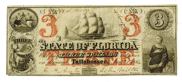 Tallahassee, FL. $3, Issued Black on red protector, Allegorical woman on right, ship in middle, Choice VF condition. Keating & Ball. Scarce.