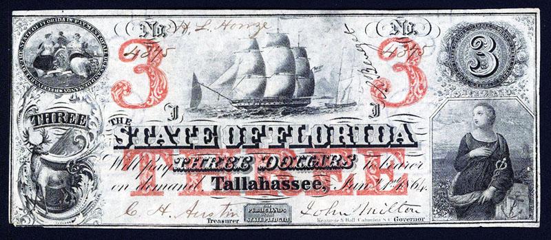 State of Florida Obsolete Banknote.Tallahassee, FL, June 1st, 1864, $3, Issued banknote, black with red protectors, Allegorical woman on the lower right, sailing ships at center, registration seal at top left, S/N 4375, VF to Choice VF condition, Attractive and scarce note, Keatings & Ball, Columbia, SC.