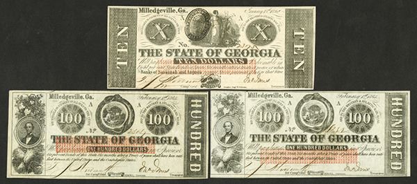 Milledgeville, Georgia, Lot of 3 notes, all issued and all Uncirculated to CU condition. Includes $10, 1862 and $100, 1863 (2), Attractive banknote trio.