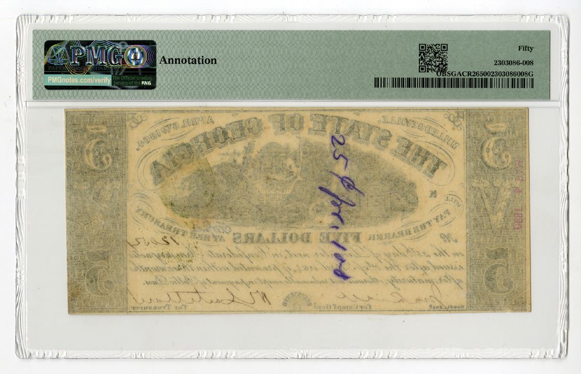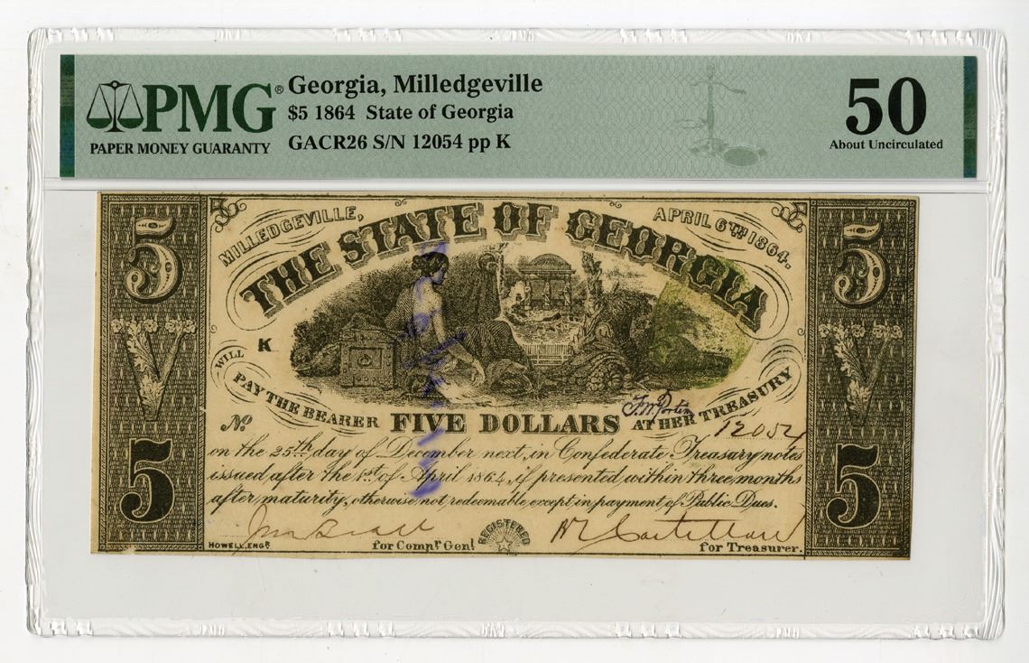 Milledgeville, Georgia, 1864. $5, P-S870 GACR26, Issued Banknote, Black printing with Moneta reclining on chest at top center, Green treasury seal at right side, Uniface note, S/N 12054 pp K, PMG graded About Uncirculated 50 with comment "Annotation" Howell Engraving.