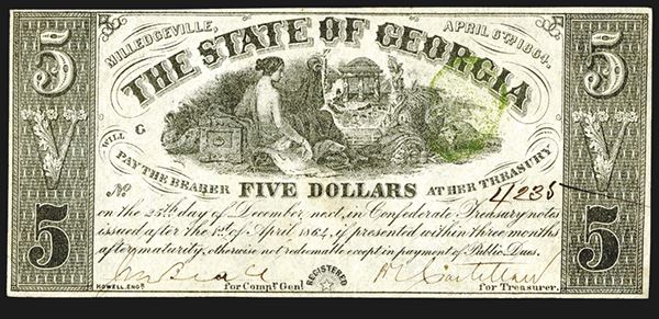 Milledgeville, Georgia, 1864, $5, Issued obsolete banknote, S/N 4235, Allegorical woman with Georgia arms in middle, Issued and uncancelled, VF to Choice VF.