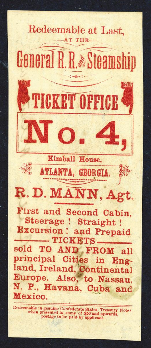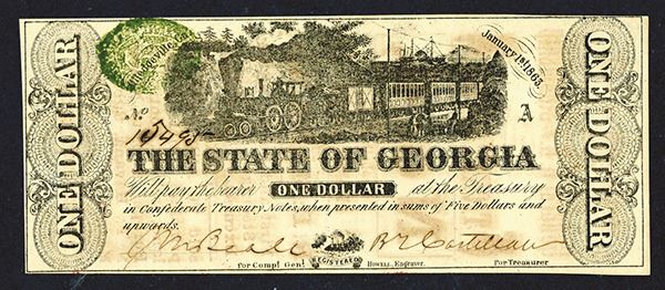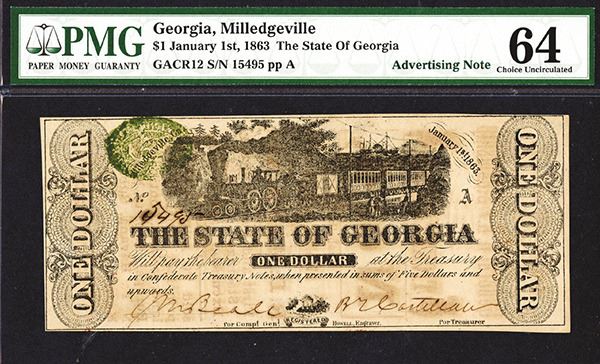 Milledgeville, Georgia, January 1st, 1863, $1, GA-CR12 (P-S863), Steamship Company advertising note on back of issued banknote. S/N 15495, locomotive in middle R-L with green Treasury seal on upper left, back has red advertisement for "General R.R. and Steamship Ticket Office "No.4", Kimball House, Atlanta, Georgia, R.D.Mann, Agt., "Redeemable in genuine Confederate States Treasury Notes when presented in sums of $50 .....". PMG graded "64 Choice Uncirculated". Evidently this was issued during the Civil War since all of the destinations include numerous areas in England and the Caribbean with no mention of any Northern states. High grade Confederate advertising banknote, rare as such.