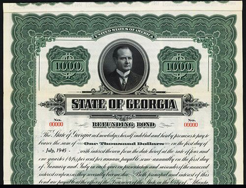 Georgia, $1000, 4 1/4 % Refunding Specimen Bond, Black on green border and underprint, Portrait top center of notable gentleman, POC's and red s/n “ 00000” , VF condition, ABNC.