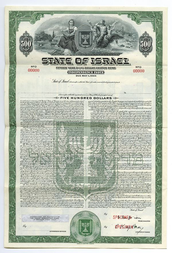 Israel. $500 Specimen Independence Issue Coupon Bond, Black print on green border and under tint, Allegorical woman and man with cherubs flanking Seal of Israel with country and city views behind them, Specimen overprints and POC's, VF-XF condition, ABNC.
