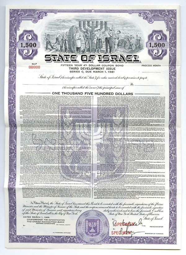 Israel. $1500 Specimen 4% 3rd Development Issue, Series C Coupon Bond, Black print on purple border and under tint, Group of Israeli citizens standing together at top in front of a Menorah with settlers in the background, Specimen overprints and POC's, VF-XF condition, ABNC.