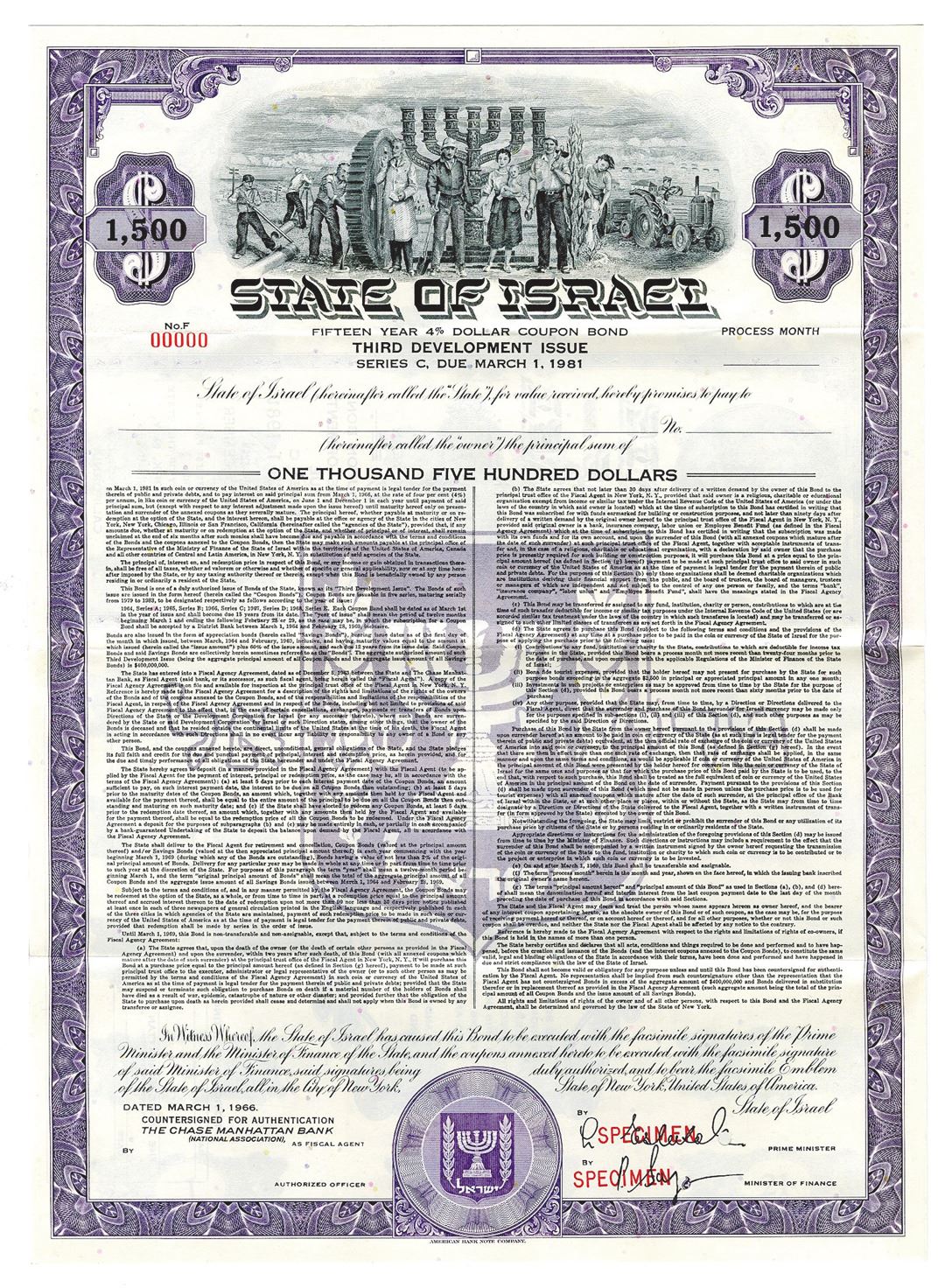 Israel. $1,500 Specimen 4% Series B, 3rd Development Issue, Coupon Bond, Black print on blue/purple border and under tint, Group of Israeli citizens from all walks of life standing together at top, Specimen overprints and POC's, VF-XF condition, ABNC.