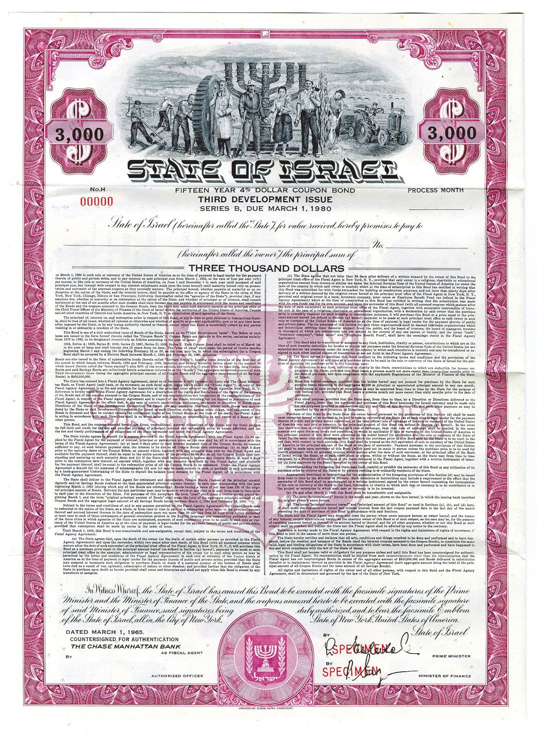 Israel. $3,000 Specimen 4% Series B, 3rd Development Issue, Coupon Bond, Black print on dark pink border and under tint, Group of Israeli citizens from all walks of life standing together at top, Specimen overprints and POC's, VF-XF condition, ABNC.