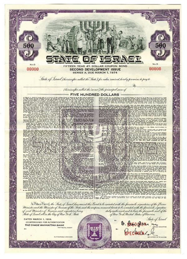 Israel. $500 Specimen 4% Series A 2nd Development Issue Coupon Bond, Black print on purple border and under tint, Group of Israeli citizens from all walks of life standing together at top with a Menorah behind them, Specimen overprints and POC's, VF-XF condition, ABNC.