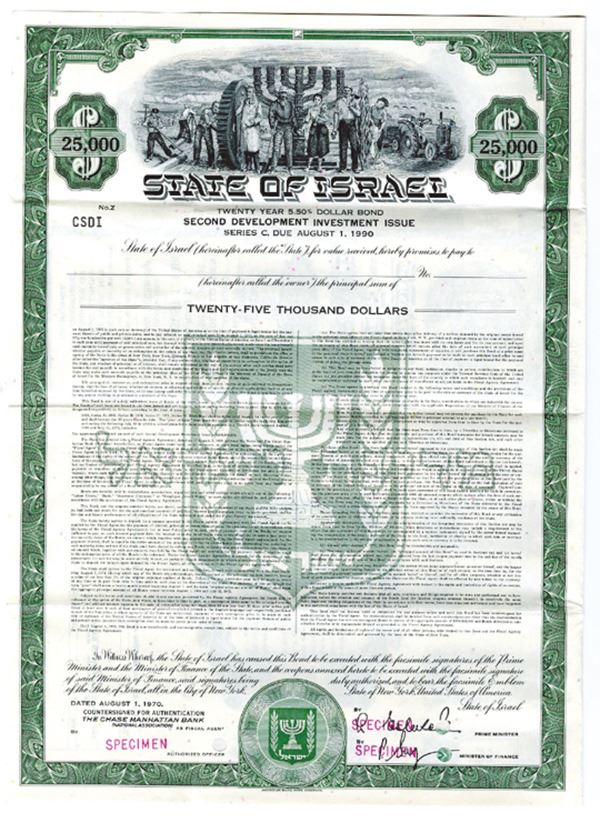 Israel. $25000 Specimen 5.50% Series C 2nd Development Investment Issue Coupon Bond, Black print on dark green border and under tint, Group of Israeli citizens from all walks of life standing together at top, Specimen overprints and POC's, VF-XF condition, ABNC.