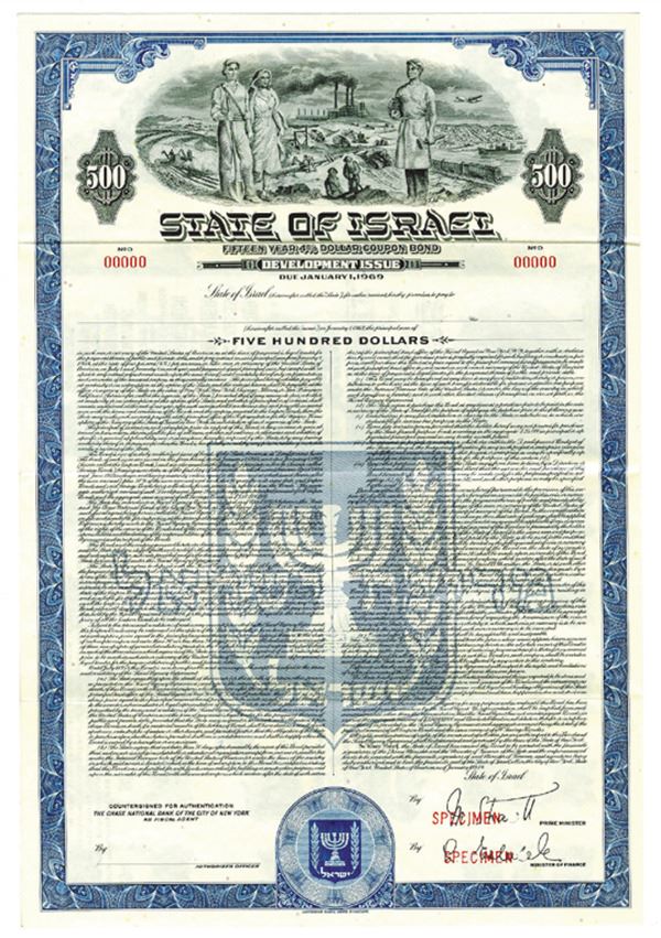 Israel. $500 Specimen 4% Development Issue Coupon Bond, Black print on blue border and under tint, Group of Israeli citizens from all walks of life standing together at top with a Menorah behind them, Specimen overprints and POC's, VF-XF condition, ABNC.