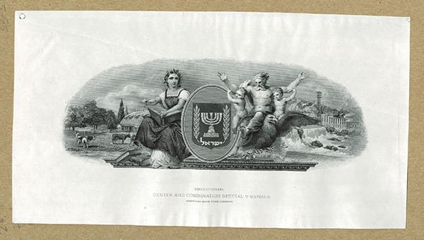 Israel, proof of early Israel Bond top from first issue of bonds issued by them. Black ink on india paper, ABN imprint at bottom with plate number, allegorical man with cherubs and woman with farming and industrial scenes behind them. AU-Uncirculated, ABNC.