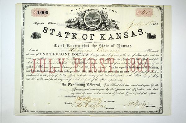 KS. $1000 Issued to and Signed by Governor Thomas Carney Ð 1864. XF.