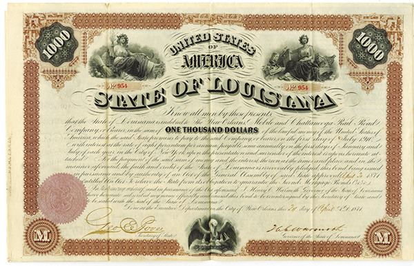 Louisiana, 1871. $1000 I/U 8% Coupon Bond, Black text with brown border, Allegorical women flank top left and right corners. Fine condition, NBN. Signed by Louisiana Secretary of State George E. Bovee, and Henry C. Warmoth as the Governor of the State of Louisiana. Warmoth was an American attorney and veteran Civil War officer in the Union Army who was elected governor and state representative of Louisiana. A Republican, he was 26 years old when elected as 23rd Governor of Louisiana, one of the youngest governors elected in United States history. He served during the early Reconstruction Era, from 1868 to 1872.