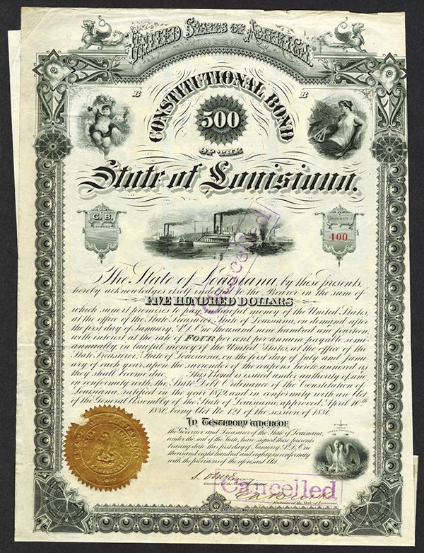 Louisiana. $500 Bond. Issued Cancelled. Coupons remain. Very Fine.