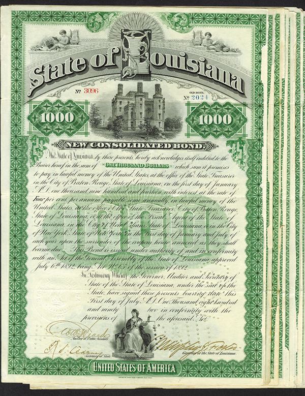 Louisiana. $1000 Bond. Issued. Redeemed. PAID Perforated at signatures. Very Fine. 7 pieces.