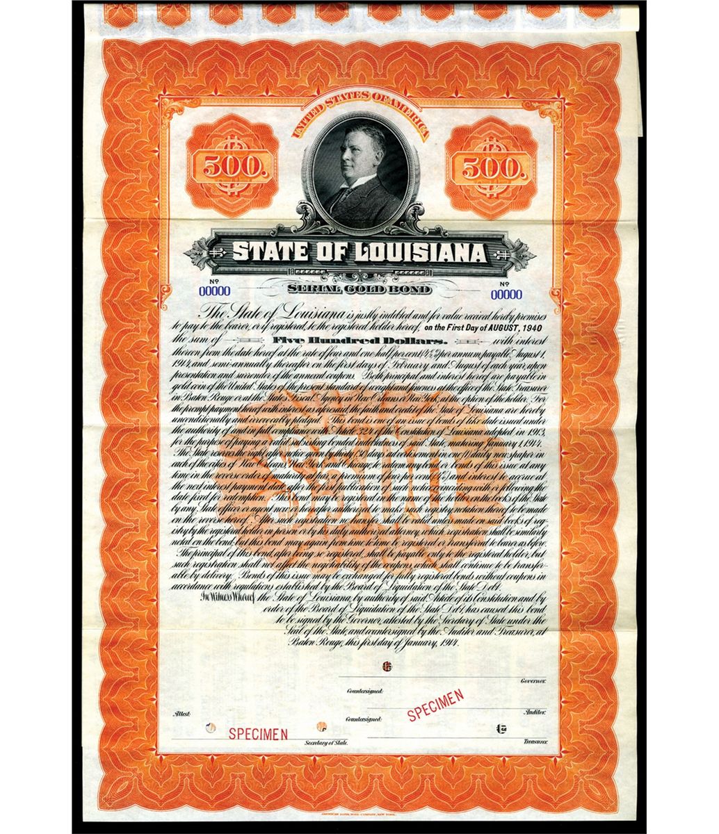 Baton Rouge, Louisiana. 1914. $500 Serial 4 1/2% Gold Specimen Bond. Orange border and underprint. XF condition. ABNC. Rare as specimen