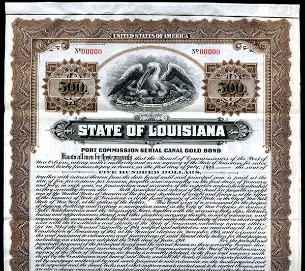 Louisiana. 1919. $500 Port Commission Serial Canal Gold Specimen Bond. Black print with brown border and underprint. State seal top center. VF-XF condition. POC's and red SPECIMEN overprint. ABNC.