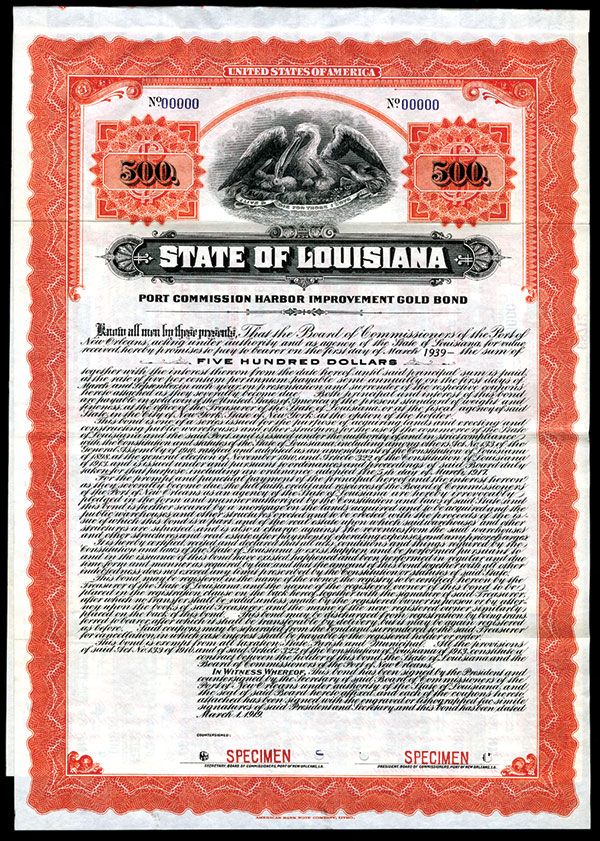 Louisiana. 1919. $500 5% Specimen Bond. Black print with red border and underprint. State seal top center. POC's and red SPECIMEN overprint. VF-XF condition. ABNC.
