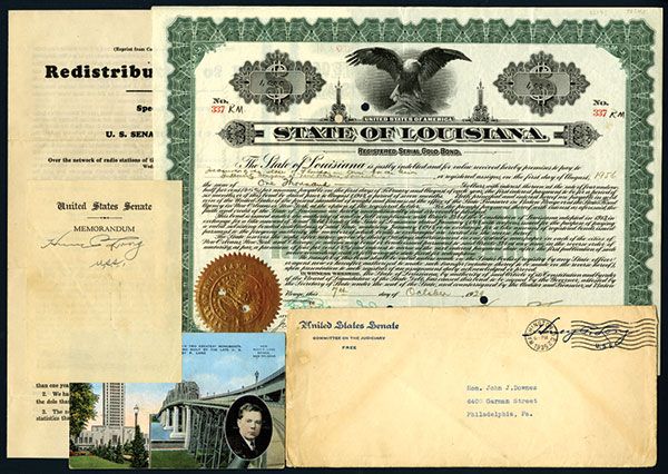 Louisiana. 1929. $1000 I/C Gold Bond. #337RM. Black print with green border and underprint. Eagle vignette top center with gold seal bottom left corner. Original signature of Huey Long while he was governor of Louisiana (1928-1932), POC's, VF condition. FLBNC. Included are also a pamphlet with speech Senator Huey Long delivered on Jan 9, 1935 regarding redistribution of wealth and a post card with a picture of the Governor and Louisiana buildings commissioned by him. Long was a United States senator from 1932 until he was assassinated in 1935.