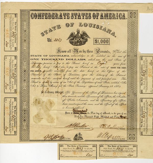 Shreveport, Louisiana. March 1st, 1863, $1000, 8%, Cr#62F, Issued and