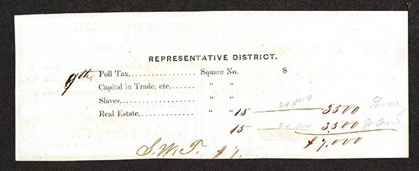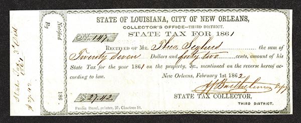 New Orleans, LA, February 1st, 1861, Black on light blue paper, Includes partially printed date of 186x with the numeral "1" handwritten in with list of taxable items on back including "Poll Tax"; "Slaves"; and "Real Estate", from the Collector's Office - Second District; XF condition and signed by the State Tax Collector. Scarce Slave related New Orleans tax documents from pre-Union Occupation. Printed by Paulin Durel, printer, Chartres St. (N.O.).