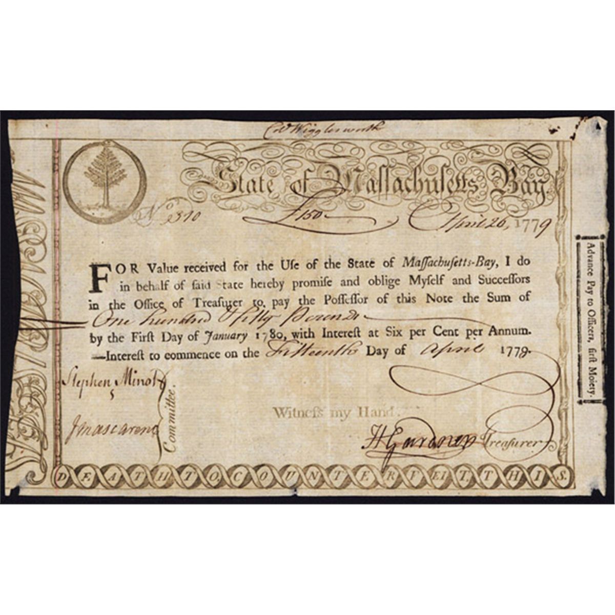 Massachusetts, April, 1779, 150 Pounds, Issued and uncancelled, Pine tree on upper left, ornate counterfoil with curved cut and text on right border ADVANCED PAY FOR OFFICERS on right, Cert.#370, Signature of Treasurer crossed out, Committee included Stephen Minot. Issued to Col. Wigglesworth, VF to XF condition . Scarce and early Colonial period and Revolutionary War related bond.