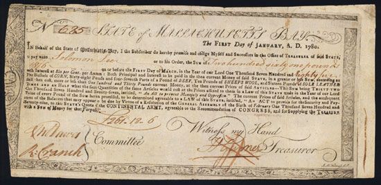 Massachusetts, January 1st, 1780. 261 Pounds 18/-0 6p, 6% Treasury Commodity Loan Certificate. No.685. Signed by Dawes and Cranch as Committee. Signed by Gardner as Treasurer. Printed on watermarked laid paper. 260mm by 125mm. Ornate border frame, left end indent. Plain title upper right. Imprint inside lower right border. Lengthy obligation, with commodities specified in the text. Faint embossed blind stamp. Issued for 261 Pounds 18/ 6 Pence. On or before March 1st, 1785. Anderson/Smythe MA-20. Rarity-6. Interesting loan for Continental Line soldierÕs pay towards the ends of the war. About Very Fine. Excellent paper with several vertical folds. Vertical endorsements